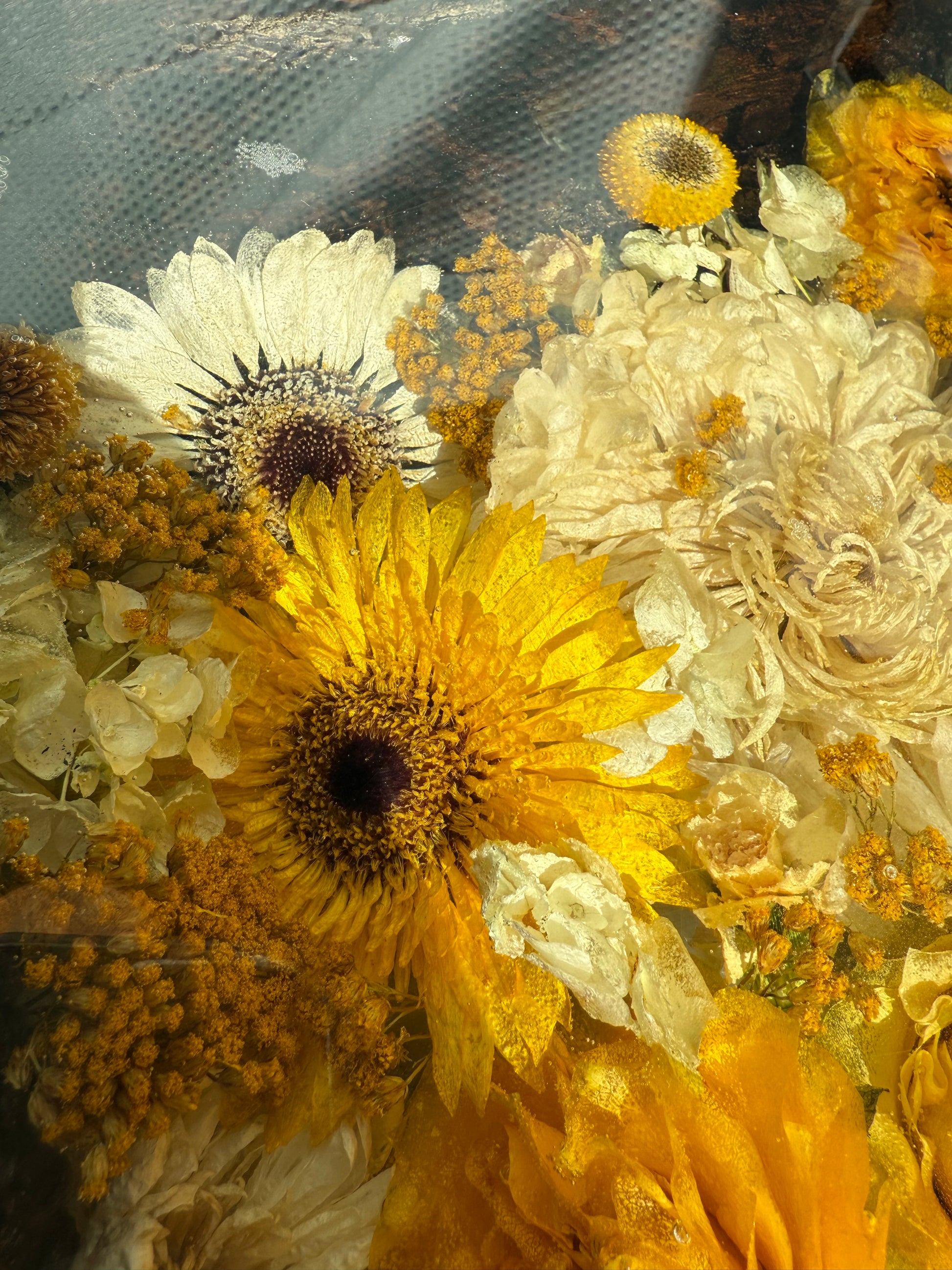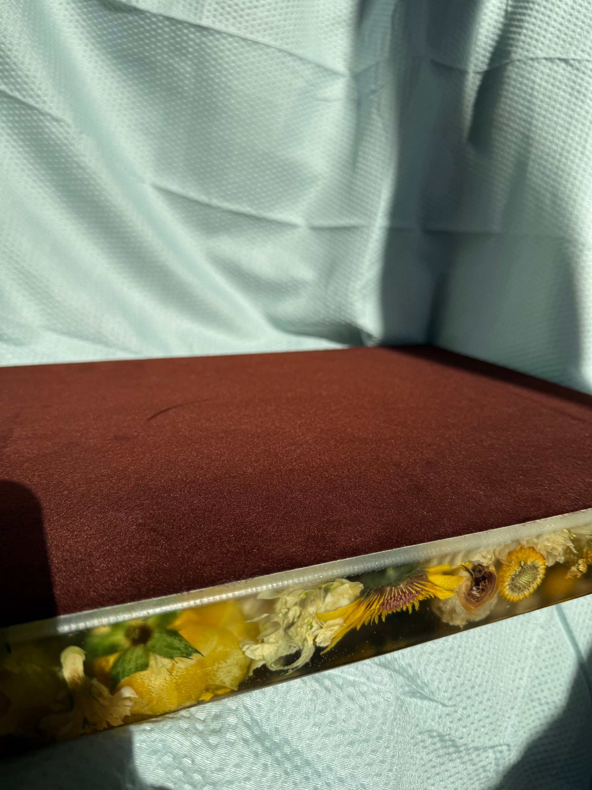 Kill dried black walnut wood with real flowers and real wasp nests that I got from my greenhouse With black velvet lining on the bottom and food safe finish on the top and lifted removable custom handles.