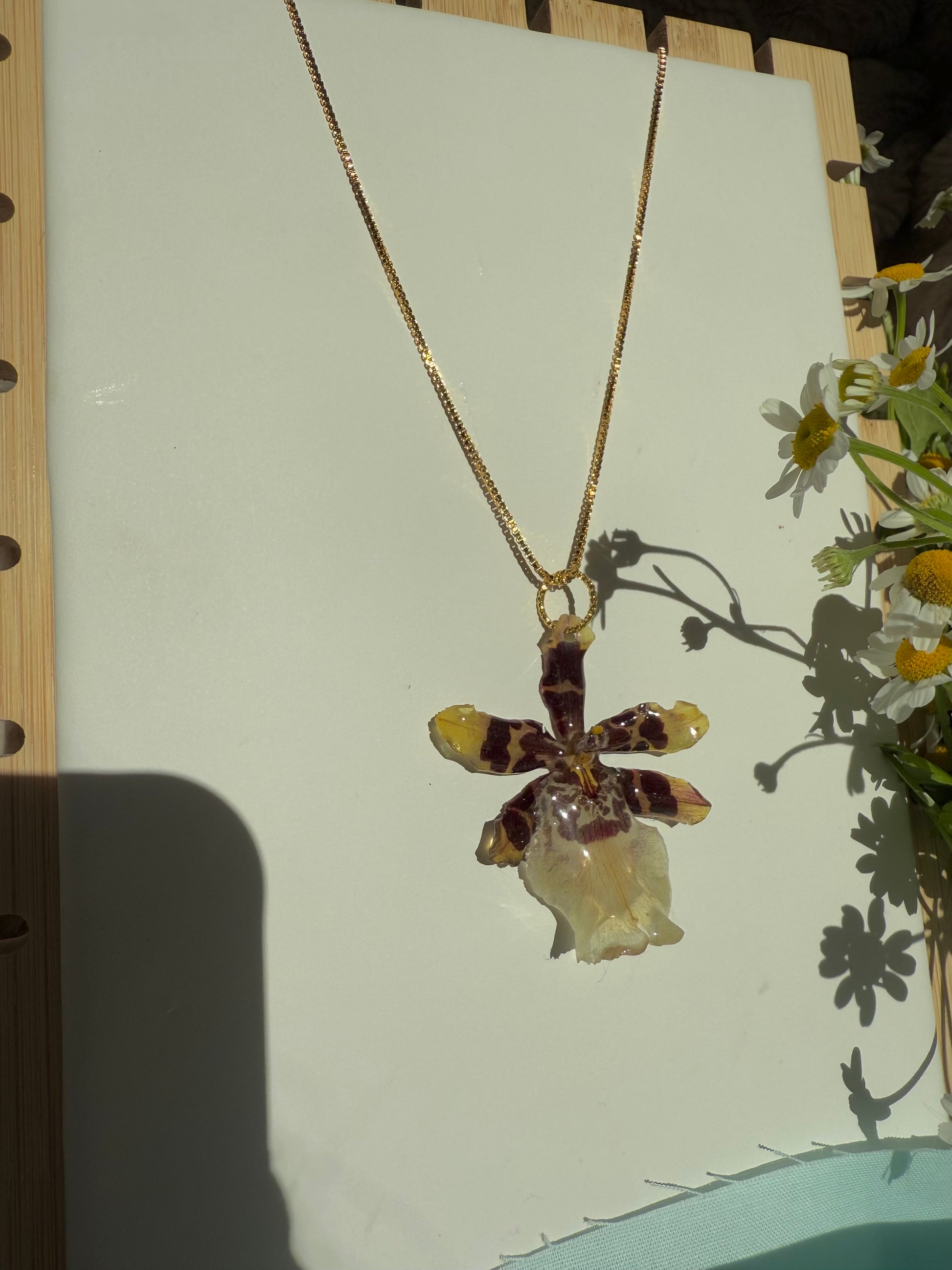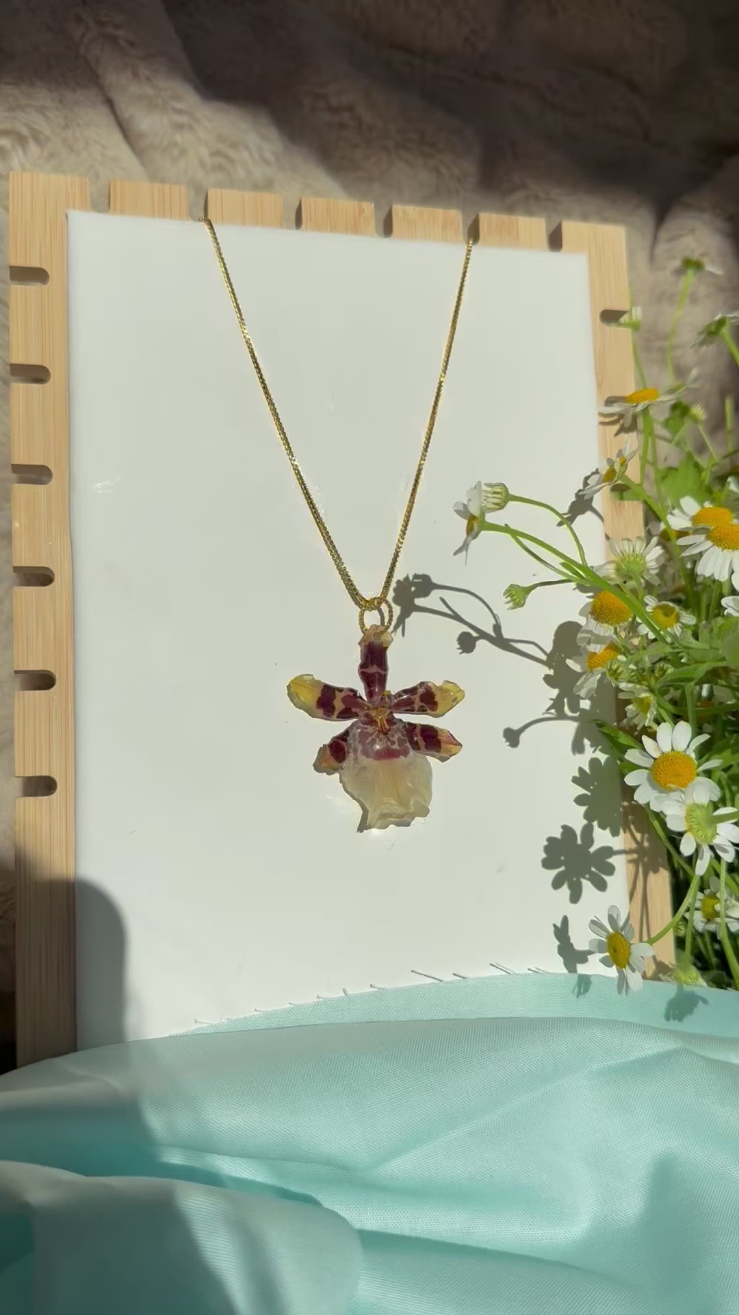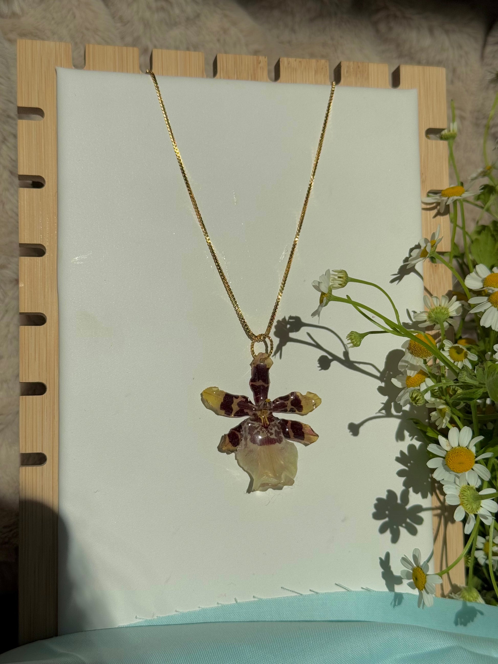This is a real exotic spotted orchid on a 16 inch gold chain