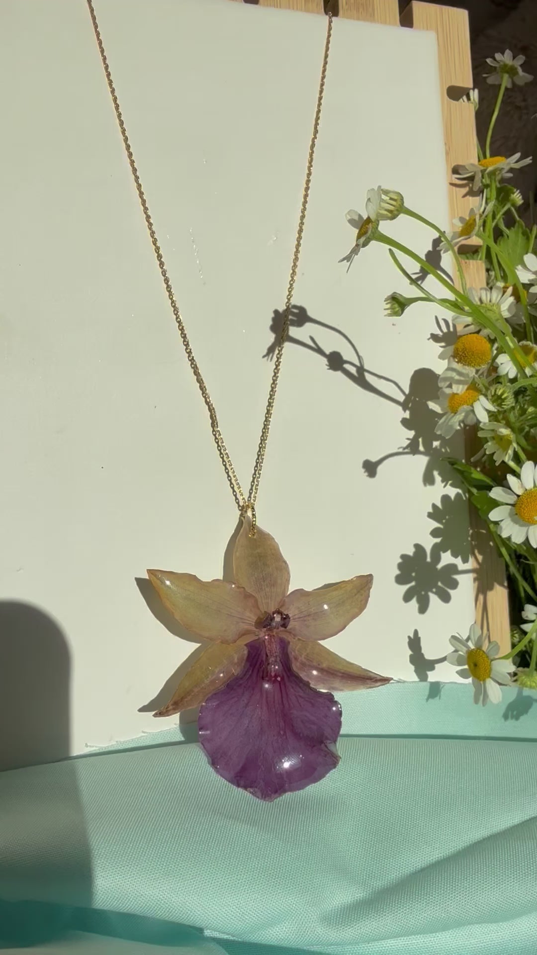 This is a large exotic purple/tan orchid on a gold 16 inch chain